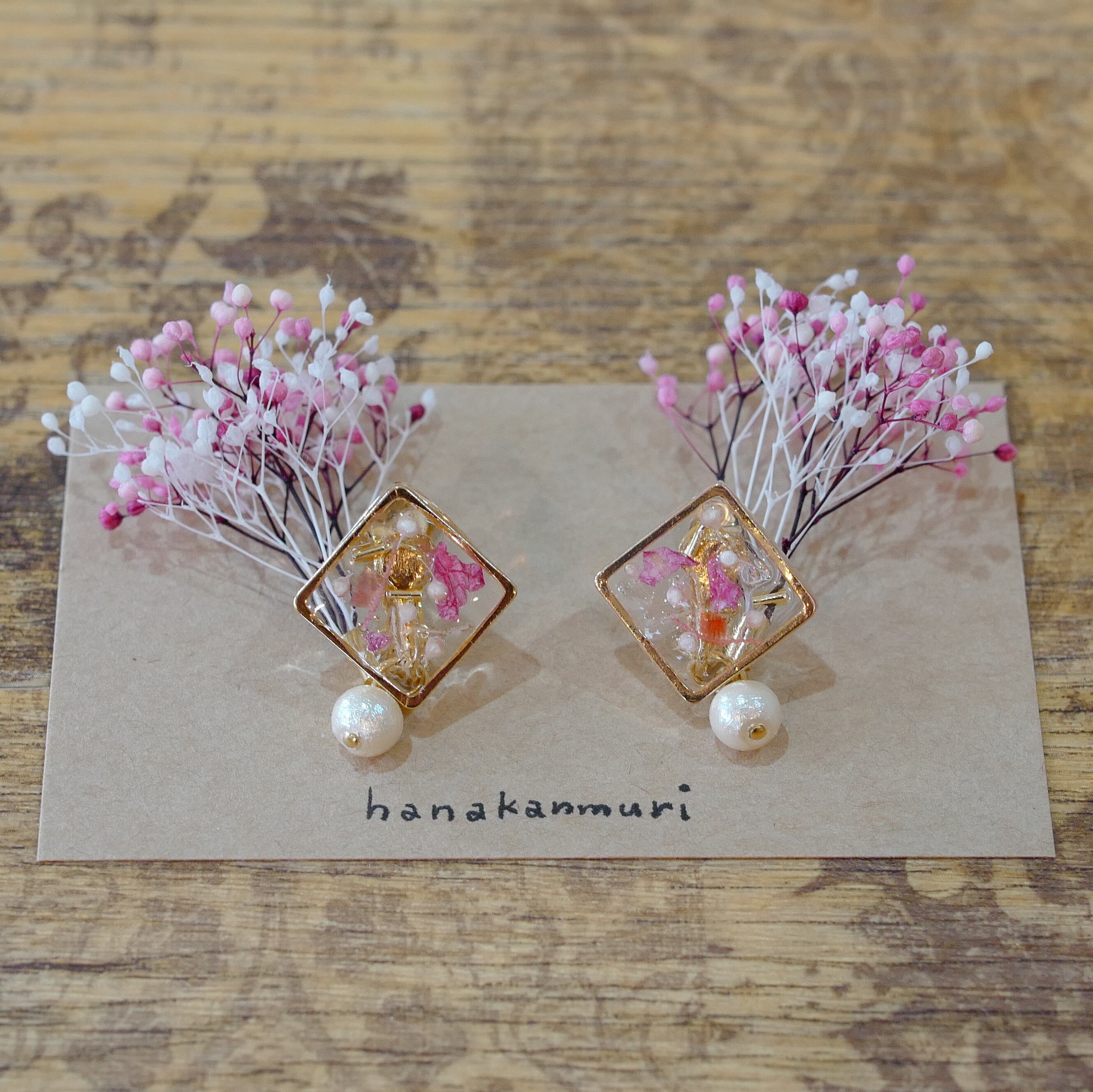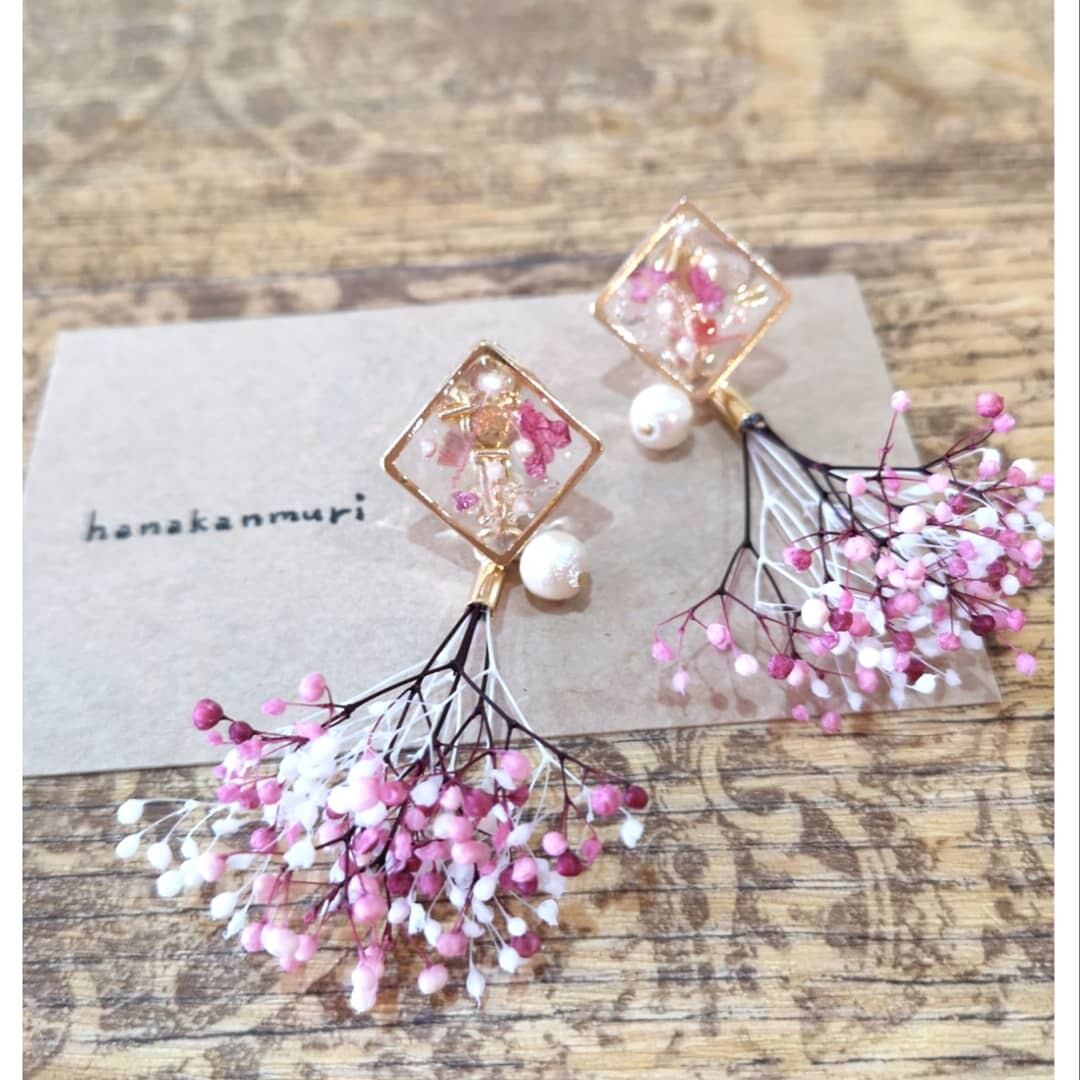花びら絵画のモチーフが可愛い、かすみ草とコットンパールのイヤリング