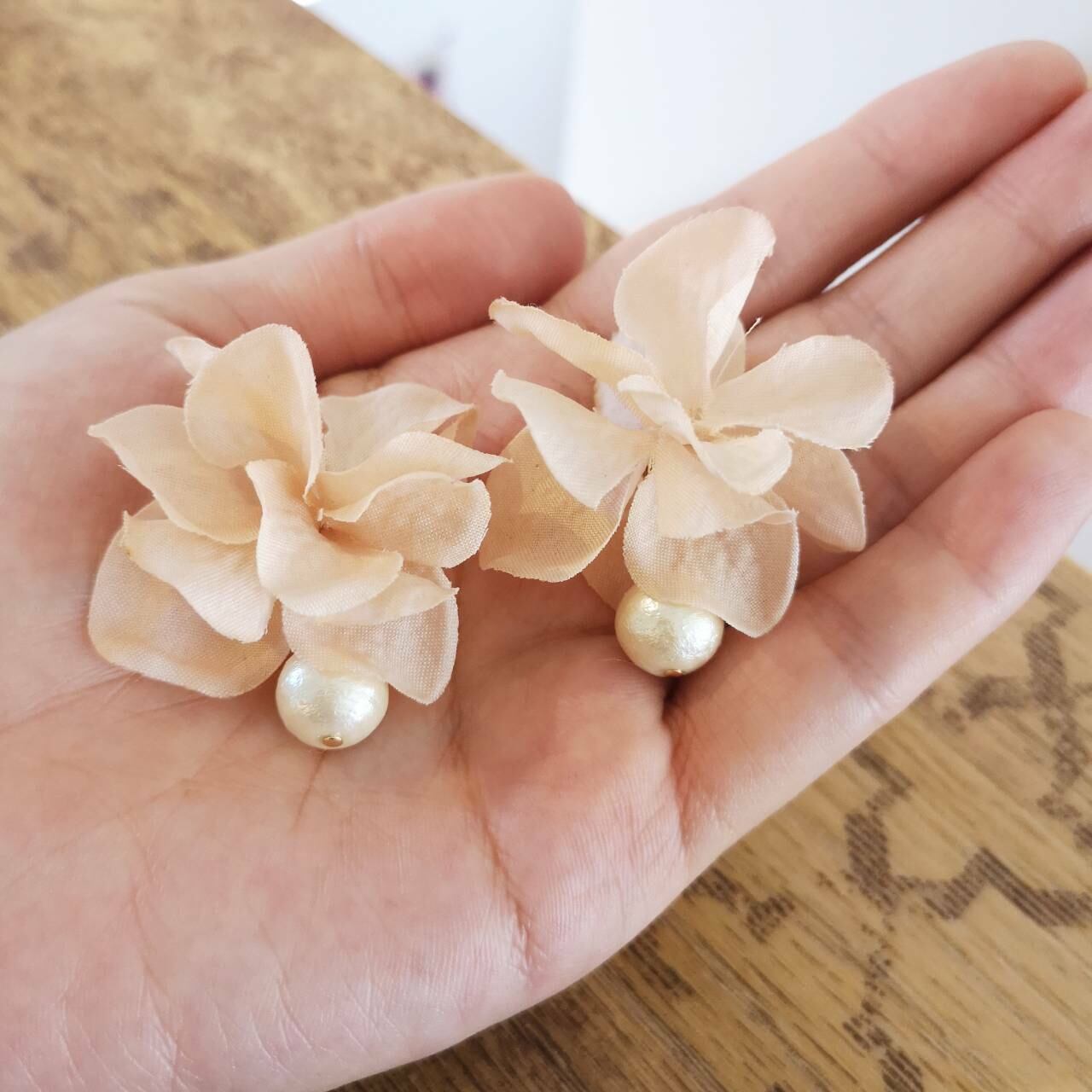 こちらの作品は『コットンパールと花びら / ライトベージュ』ピアス / イヤリングです。