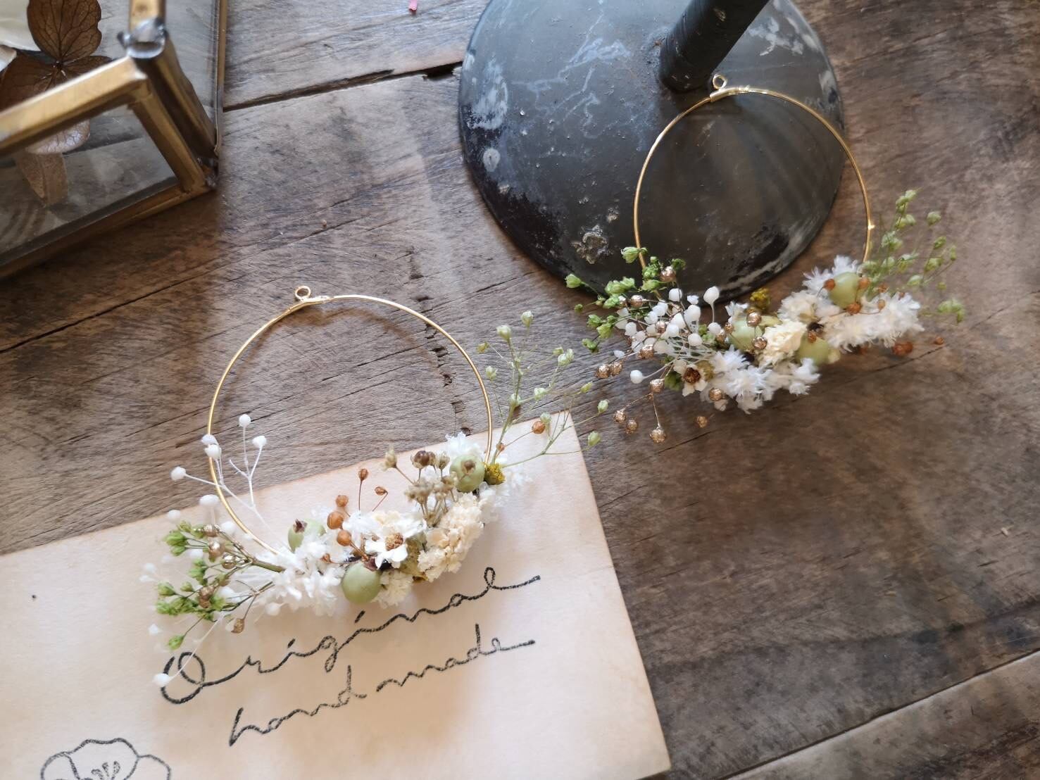 かすみ草などのお花や木の実を惜しみなくたっぷりとのせた、お花畑のハンモックピアス / イヤリングです。