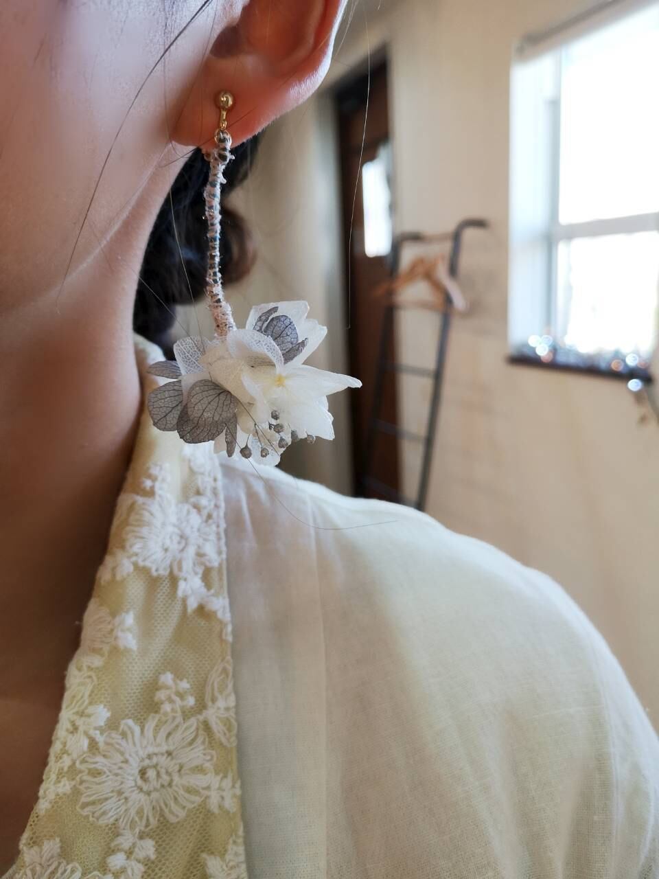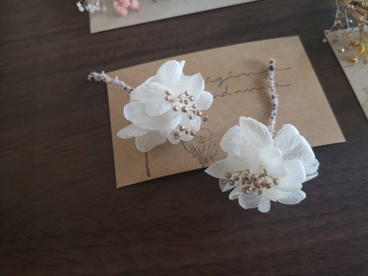 ホワイトの紫陽花にゴールドのかすみ草を合わせて、可愛さと遊び心いっぱいのアクセサリーに仕上げてみました。